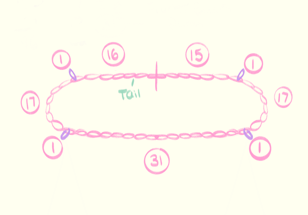This part is a little confusing to explain, so you may want to refer to my video here for clarification. We are going to start our panel in the middle of the back so we need to split the back panel in half as seen in the sketch below. Since our back panel will not be an even number, we want to put the higher number where the bottom of our chain is with the tail end (which for me is 16) and place the lower number on the top of the chain (15 for me). You want your starting side of the round to be one number higher than the other side.